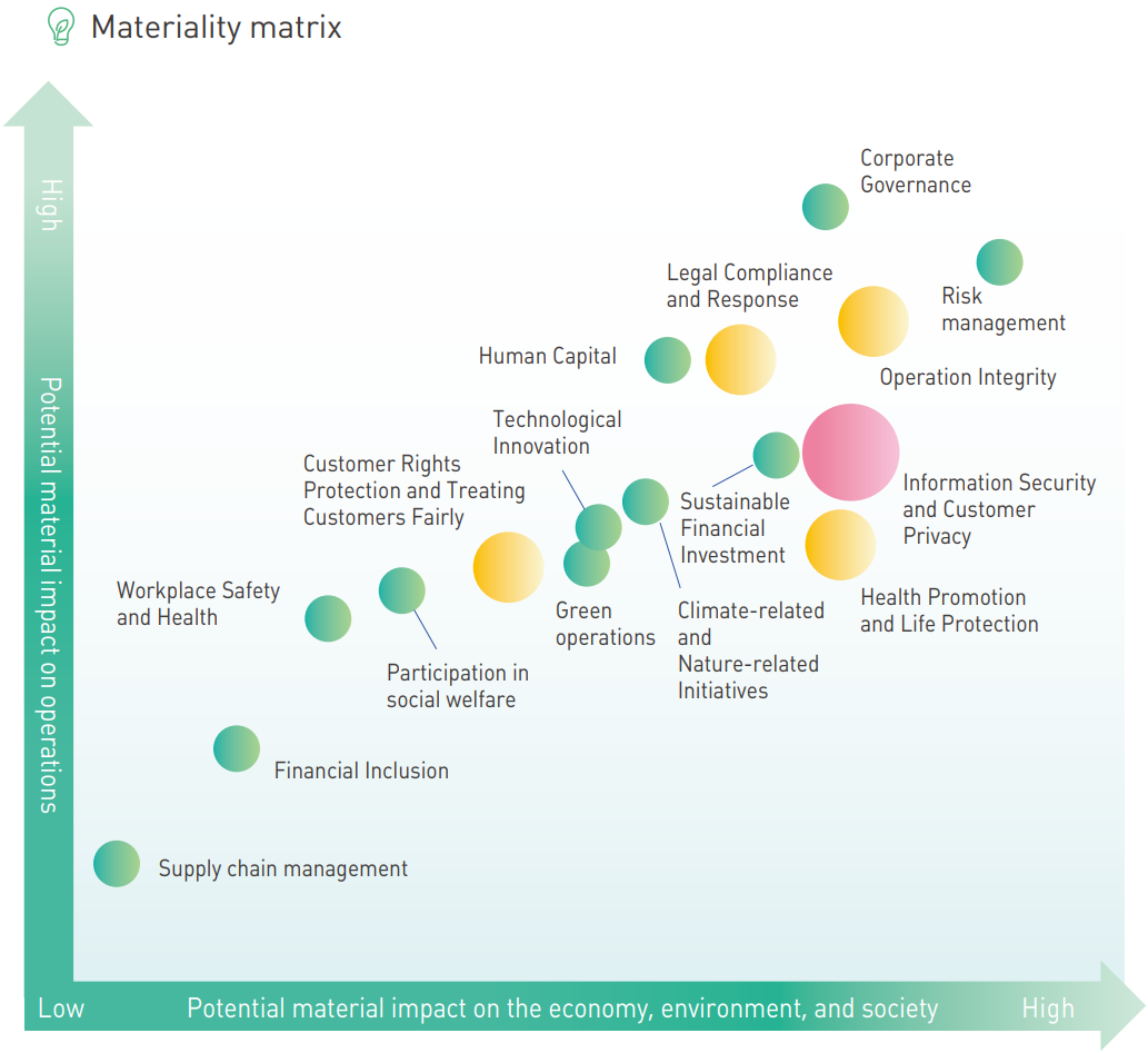 Spheres with a special color means that the issue is also one of the top five issues of concern to stakeholders. Among them, the issue in orange (information security and customer privacy) is the top issues of concern to stakeholders.