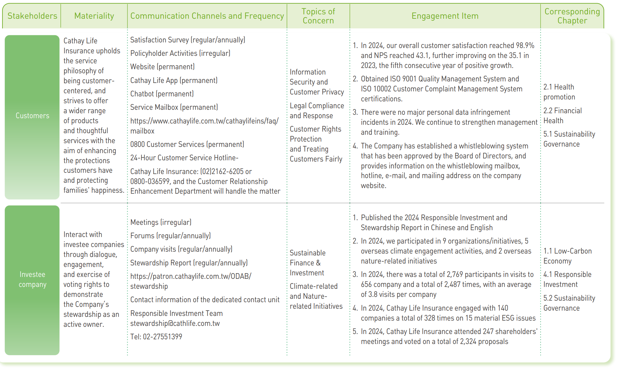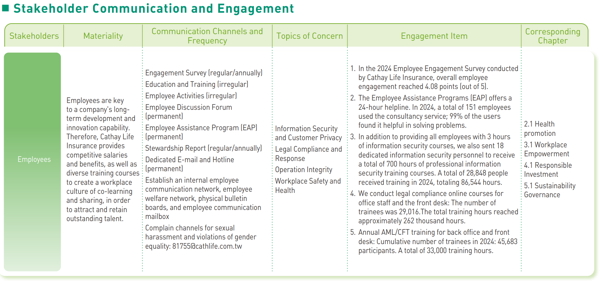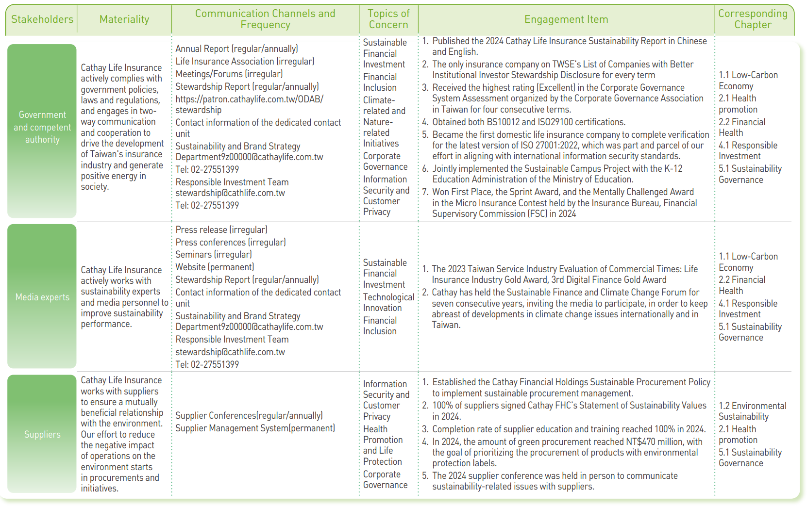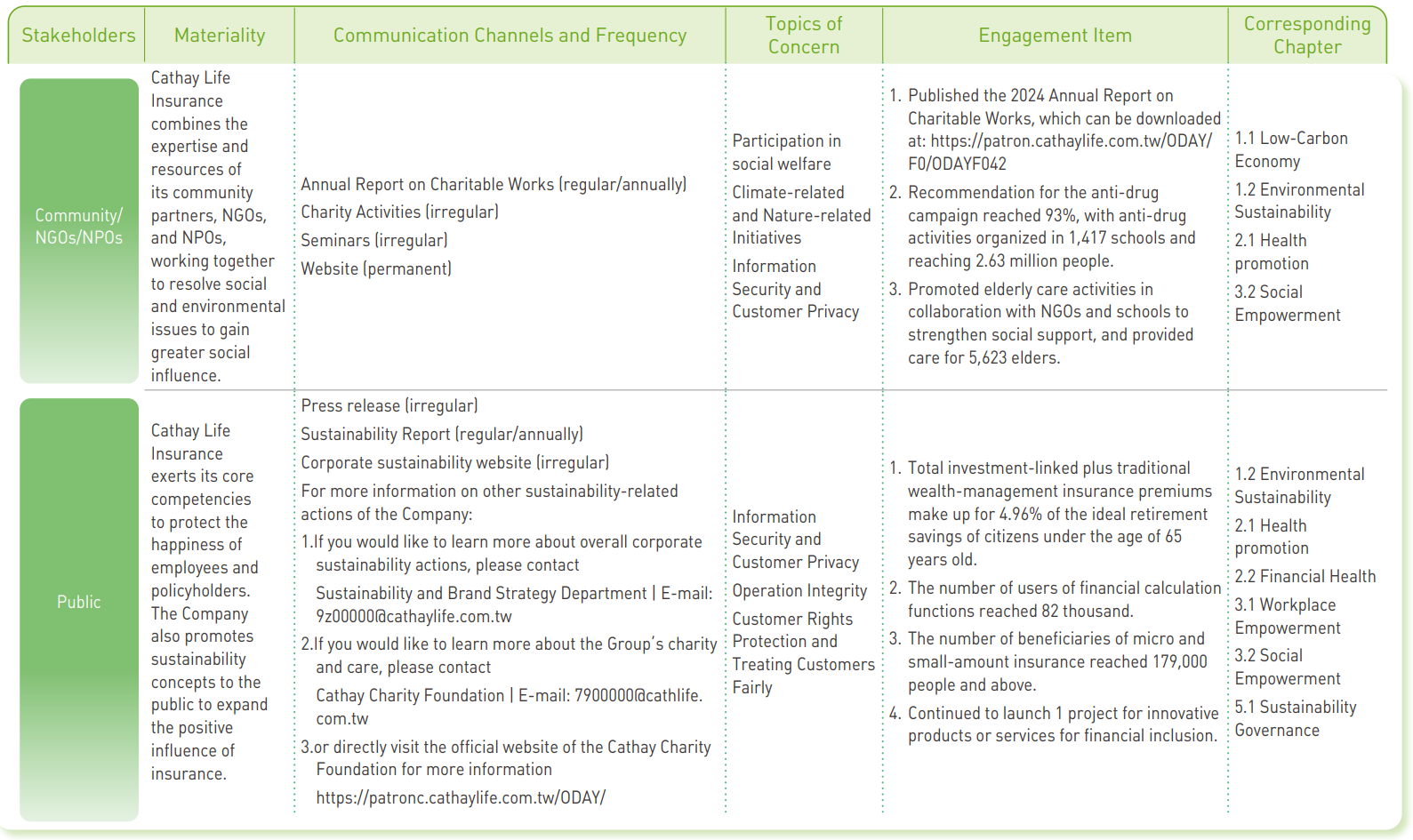 - After objective analysis and internal discussions,Cathay Life focuses on disclosures of nine material topics.